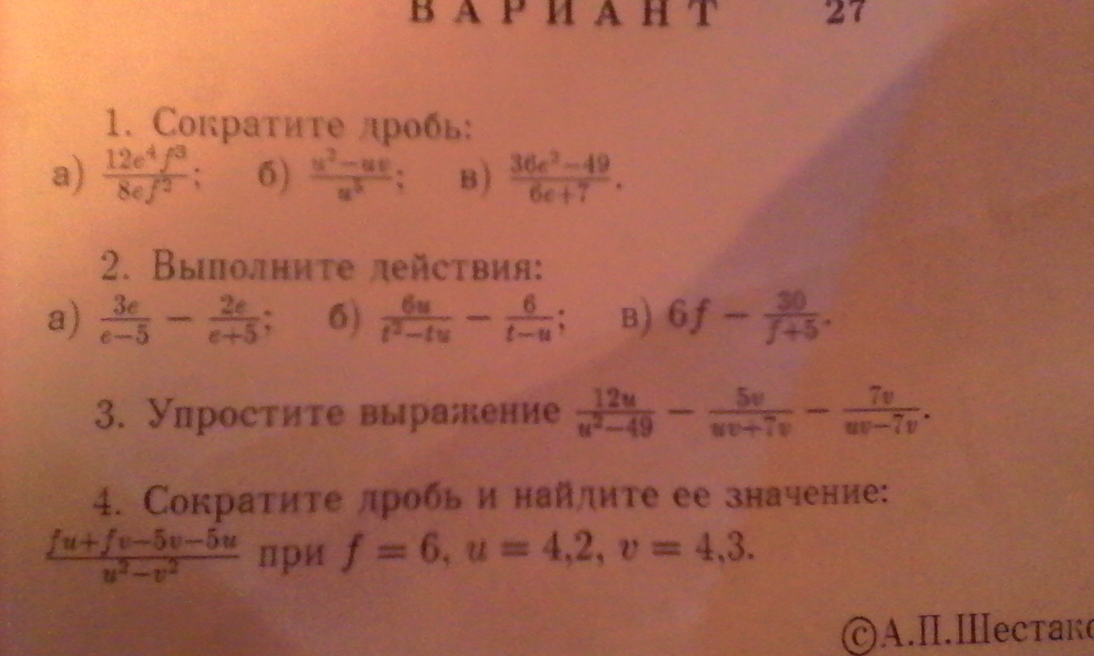Короче 1 задание а)3e^2+15e-2e^2+10e и общий знаменатель (e-5)(e+5) потом остается е^2+25 и его раскладываешь как (e+5)(e-5) и получается знаменатель такой же и зачеркиваешь все и получается 1