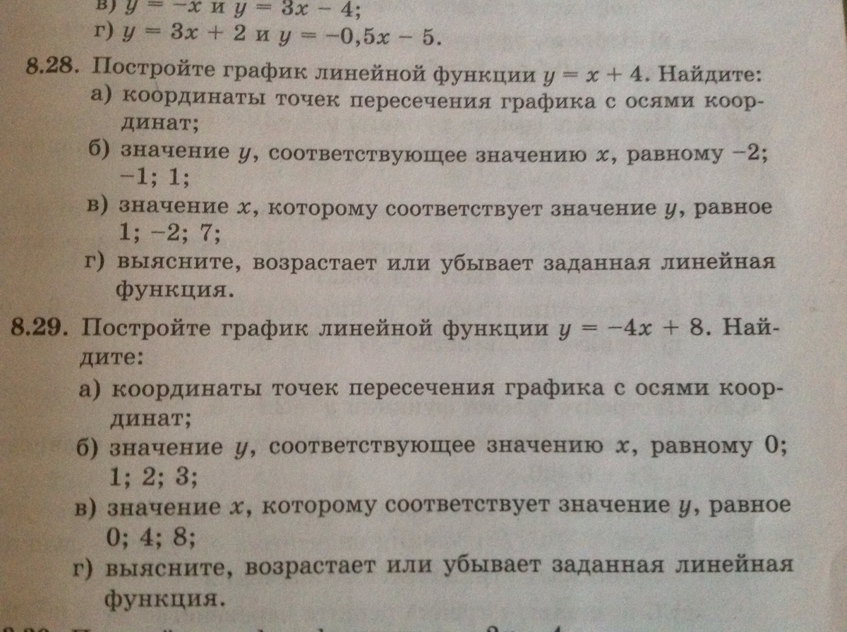 Номер 8.28:постройте график линейной функции y=x+4.Найдите а) координаты точек пересечения графика с осями координат;б)значение y,соответствующее значению x,равному -2;-1;1;;в)значение x , которому соответствует значение y равное 1;-2;7;г)выясните возрастает или убывает заданная линейная функция