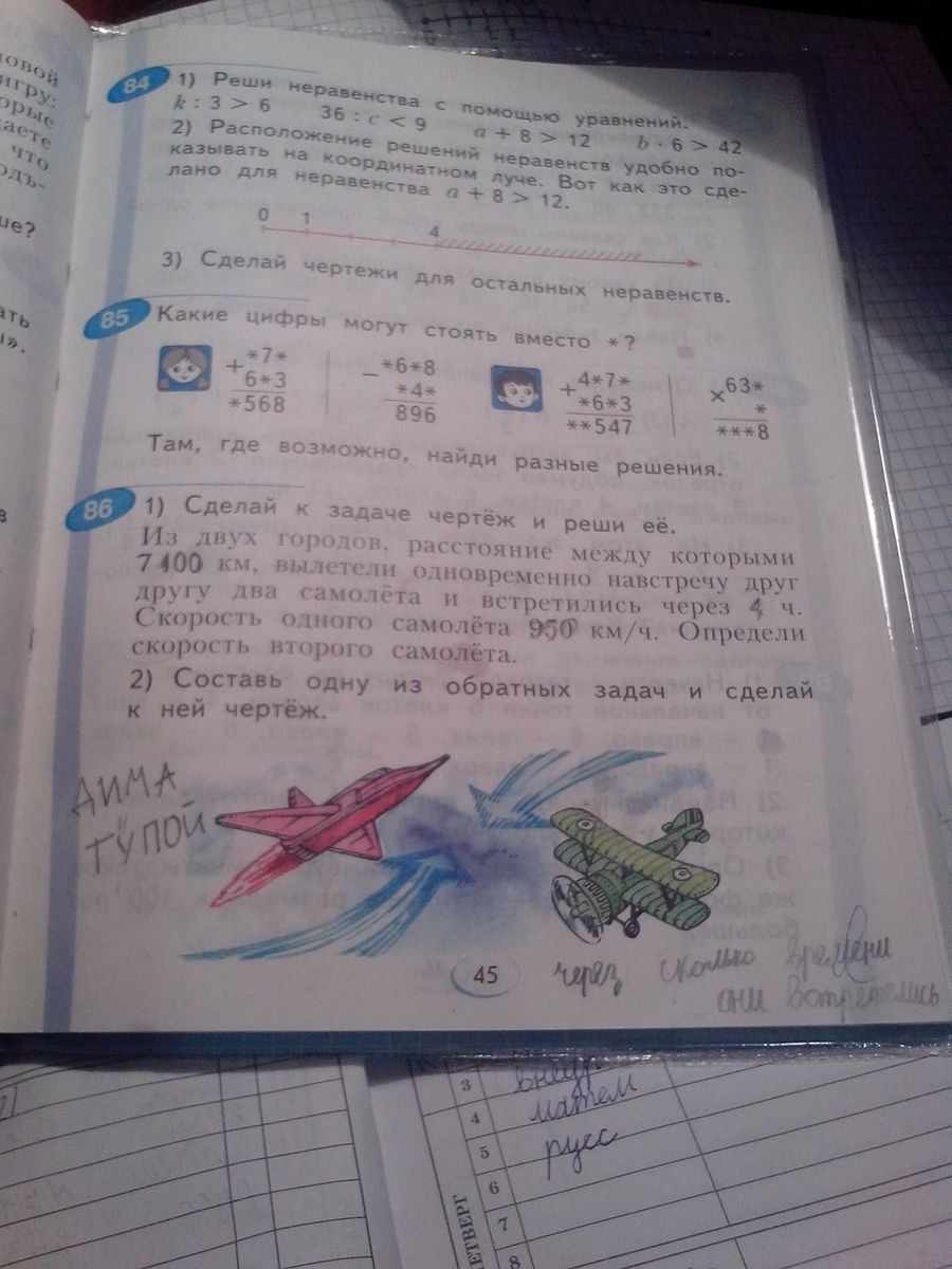 выражение:(7400-950*4):4=900(км/ч)-скорость второго самолёта.