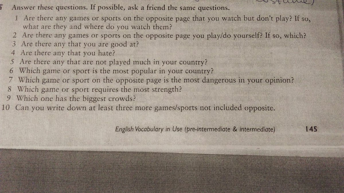 Есть ли какие-нибудь игры или спорт,которые ты смотришь, но не играешь? Если да, то какие, и где ты их смотришь?2.Есть ли игры или спорт, в которые ты играешь сам? Если да,то какие?3.Есть ли те,в которых ты хорош?4.Есть ли те, которые ты ненавидишь?5.Есть ли те, в которые не играют в твоей стране?6.Какой вид спорта самый популярный в твоей стране?7.Какой, по твоему мнению, самый опасный спорт (или игра) Остальное точно сказать не могу Х)