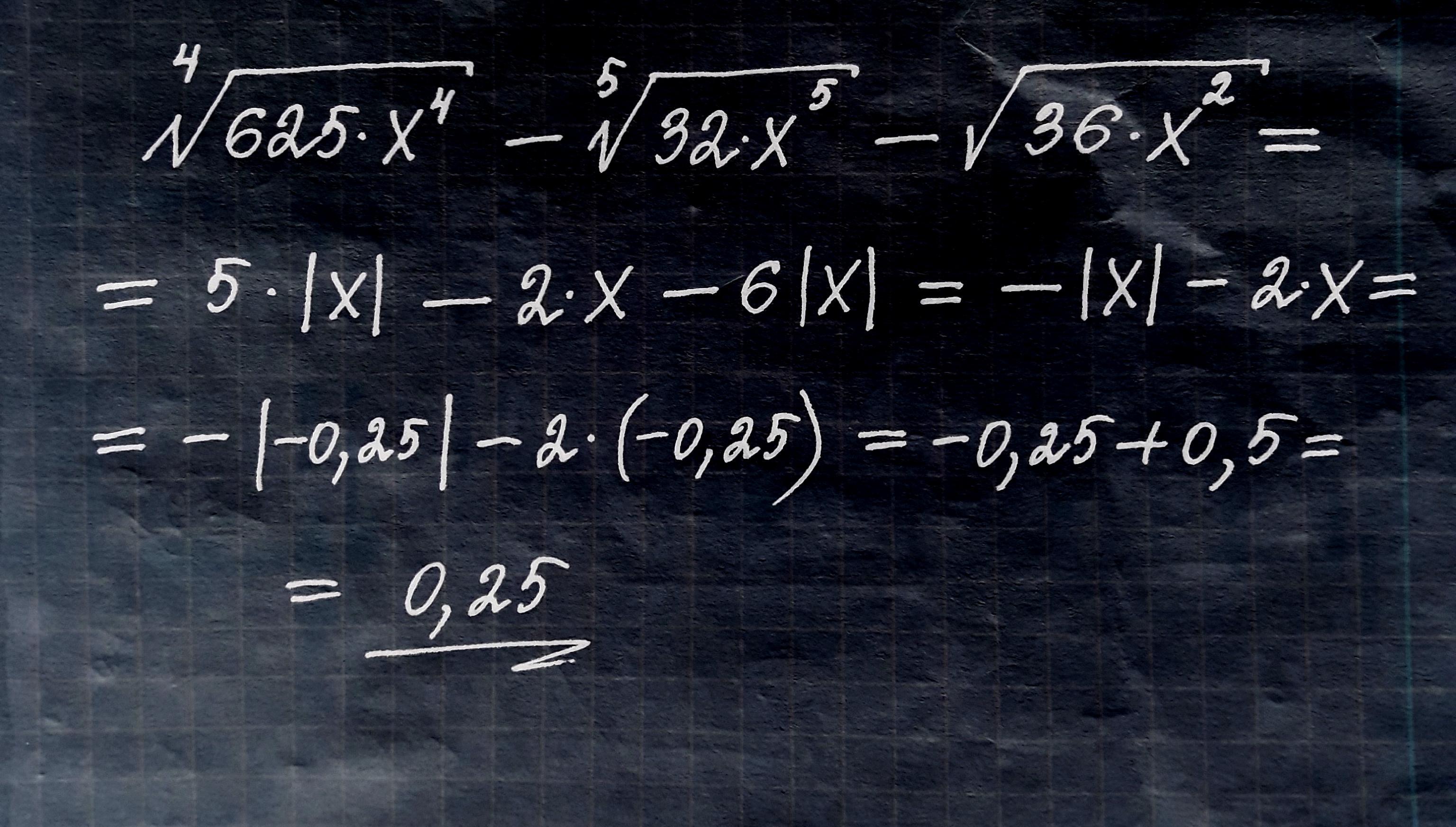 Упростить выражение 4корень из 625 х^4 - 5корень из 32 х^5 - корень из 36 х^2 и найдите его значение при х=-0,25