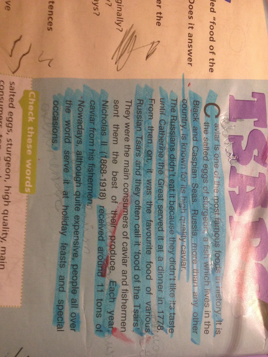 Икра - один из самых известных продуктов в истории. Это соленые яйца осетра, рыба, которая живет в Черном и Каспийском морях. Русские, больше, чем любая другая страна, славится высоким качеством икры. Русские не ели его, потому что им не нравился вкус, пока ЕКАТЕРИНА великая не поужинала с ним в 1778 году. С тех пор, она стала любимой едой различных российских царей и они часто называли его "пища царей'.