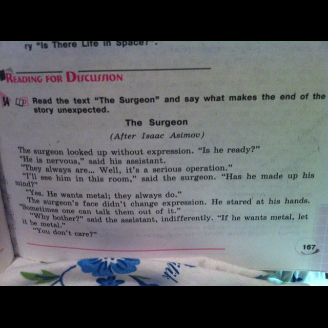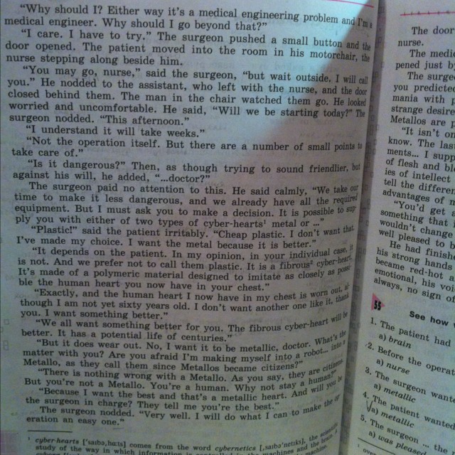 This is a fantastic story about future, when it would be possible to do very unusual operations on heart. It tells us about the surgeon who doesn't like the idea, that all the people who needs a new heart, wants to have only the matal one. He tries to convince his new patient to have not a metal but a plastic heart. He is sure that plastic heart is much more similar to a real human and especially in that particular case. But neither the pacient, nor his assistant doesn't understand that idea. the pacient doesn't think that he would turn into the robot with a new heart and he is sure that such heart would serve him much longer than a cheap plastic. Finally the surgeon agrees with him.