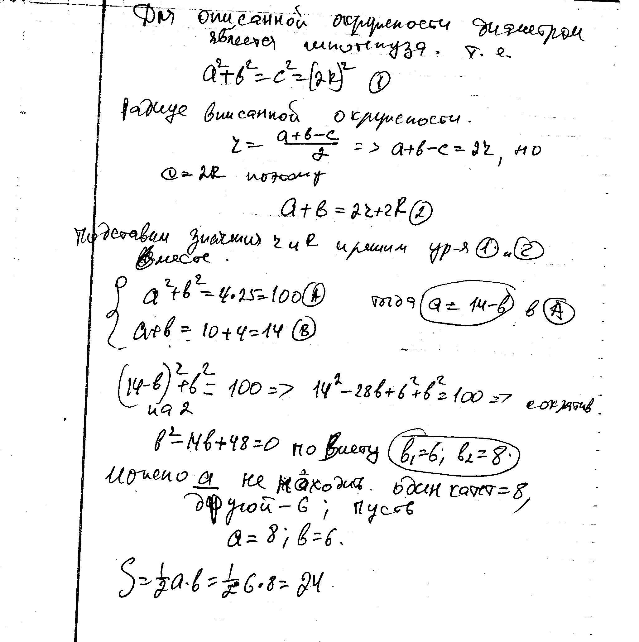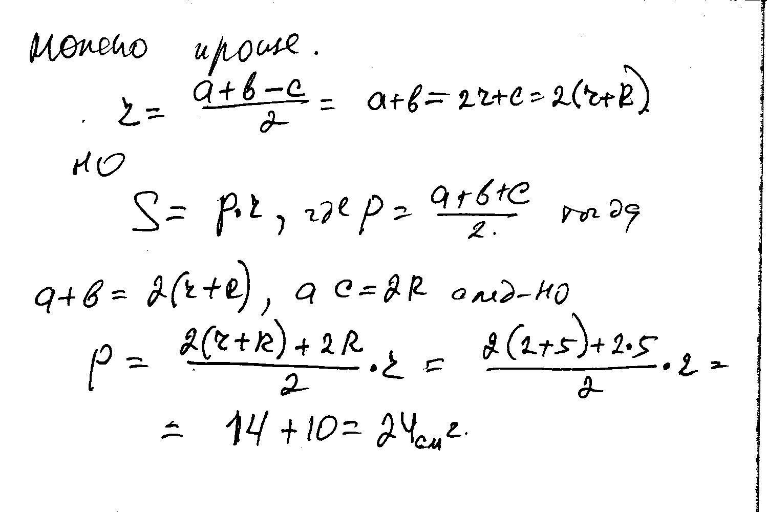 Найдите площадь прямоугольного треугольника, если радиус вписанной в него окружности r=2 см, а радиус описанной окружности R=5 см. (помогите пожалуйста)