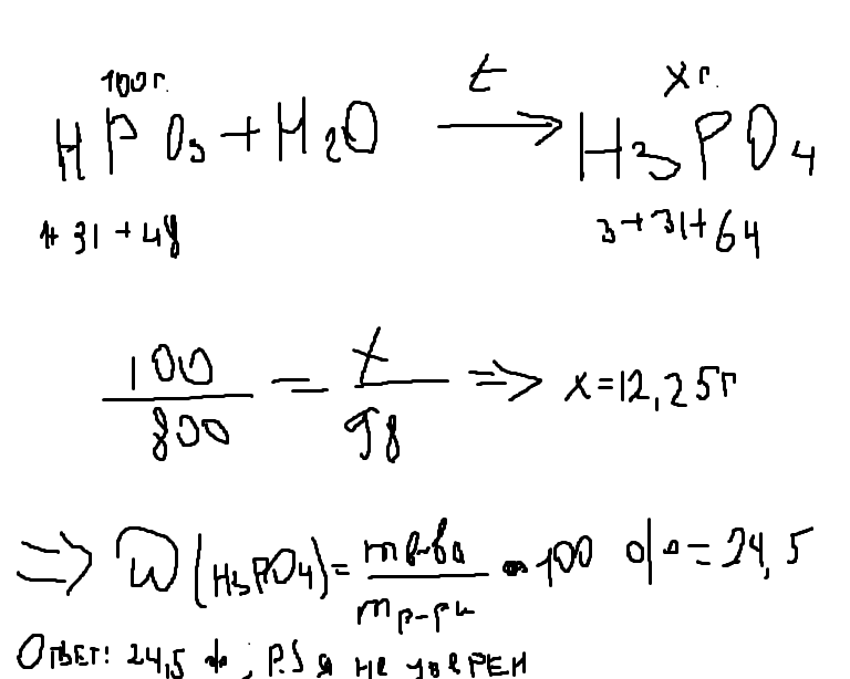 100 г метафосфорной кислоты растворили при нагревании в 50 мл воды. Какое вещество полуичлось в растворе и какова его массовая доля в растворе?
