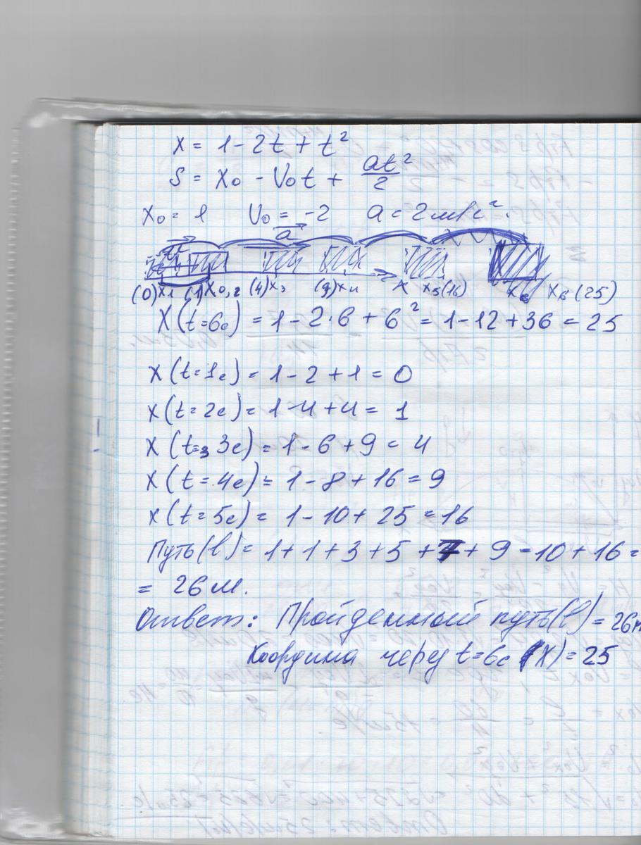 Уравнение движения имеет вид х=1-2t+t^2. Чему равен пройденный путь и координата тела через 6 с?