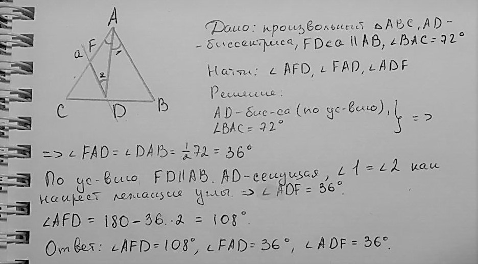 Отрезок АD – биссектриса треугольника АВC. Через точку D проведена прямая, параллельная стороне AB и пересекающая сторону AC в точке F. Найти углы треугольника ADF, если угол BAС = 72 градусам