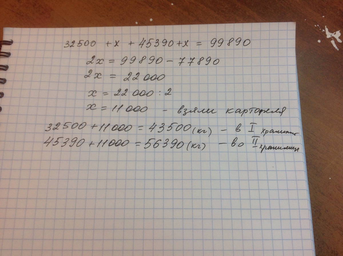 В двух хранилищах 99 890 кг картофеля.Когда из каждого хранилища взяли картофеля поровну,то в первом осталось 32 500 кг а во втором 45 390 кг. Сколько килограммов картофеля было в каждом хранилище?