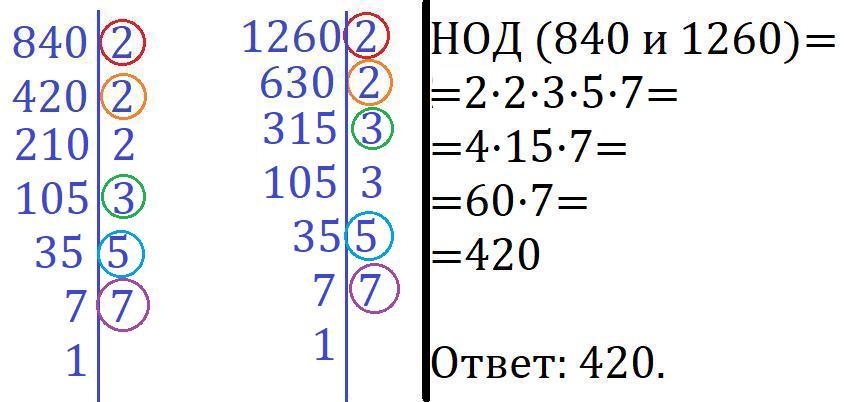 НОД (840; 1260) = 2 * 2 * 3 * 5 * 7 = 420