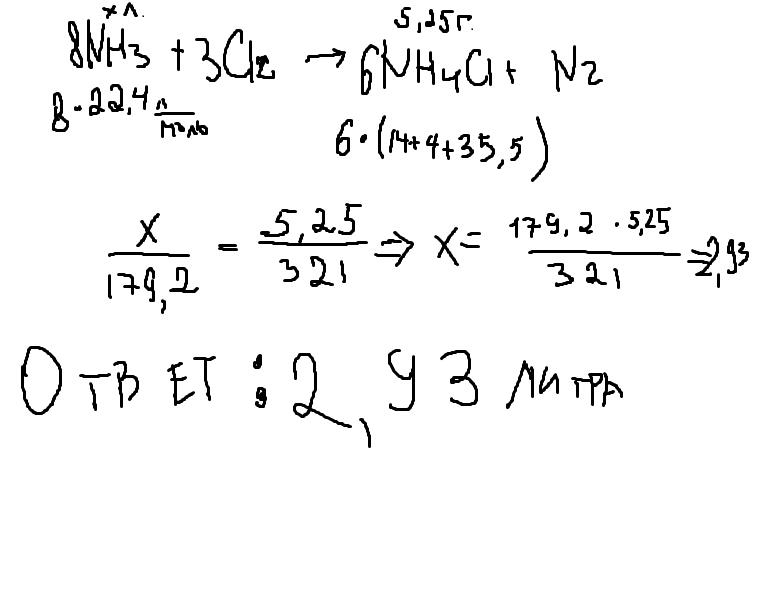 какой объём аммиака(н.у.)необходимо взять для получения хлорида аммония массой 5.25г.? помогите!!!!срочно нужно!!