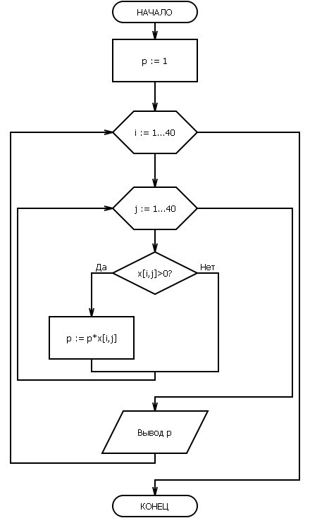 Разроботать блок схему для задачи: Определить произведение положительных элементов матрицы X (40,40)