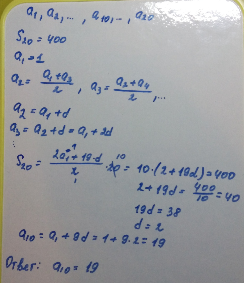 В последовательности чисел первый элемент равен 1, а каждый последующий элемент равен среднему арифметическому двух своих соседей. Сумма первых 20 членов последовательности равна 400. Найдите 10-ый член последовательности.