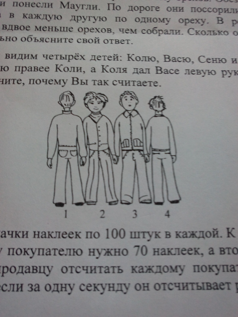 На картинке мы видим четырёх детей: Колю, Васю, Сеню, Яна. Известно, что мы видим Сеню правее Коли, а Коля дал Васе левую руку. Найдите, как кого зовут, и объясните, почему вы так считаете?
