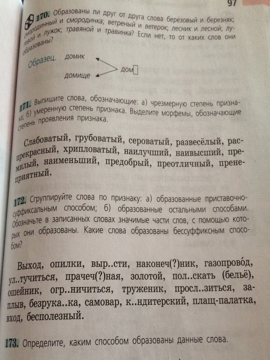 б) выход( бессуффиксный), вырасти(приставка вы-), газопровод, прачечная(суффикс -н), золотой(корень золот), полоскать(бельё), труженик(суффикс -ник), заплыв(бессуффиксный), самовар(корень сам - вар),