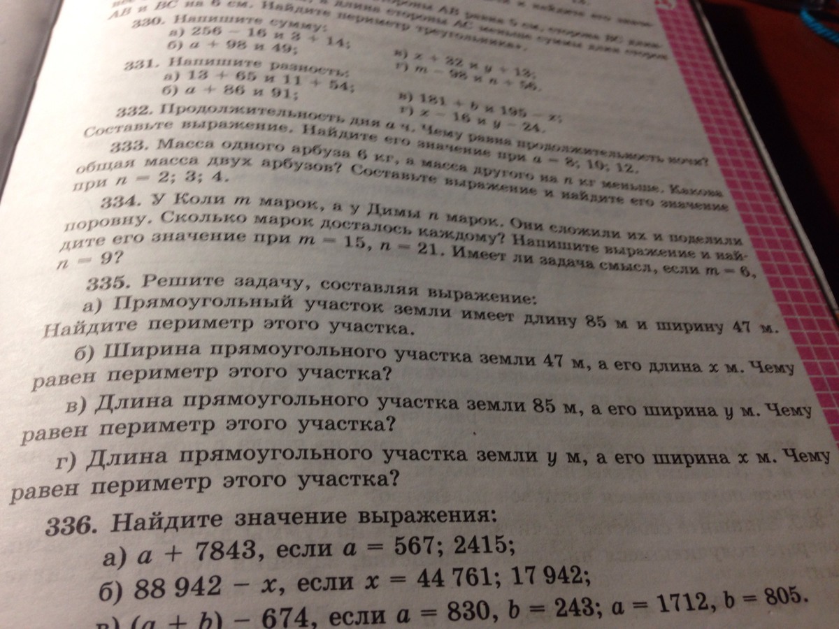 Решите задачу , составляя выражения А) Прямоугольный участок земли имеет длину 85 м а ширину 47 м найдите периметр участка. Б) Ширина прямоугольного участка земли 47 м а Его длина x м . Чему равен Периметр этого участка? В) Длина прямоугольного участка земли 85 м а его ширина игрек(у). Чему равен периметр участка? Г) Длина прямоугольного участка земли игрек(у) м а его ширина x метров чему равен периметр этого участка? Номер 335
