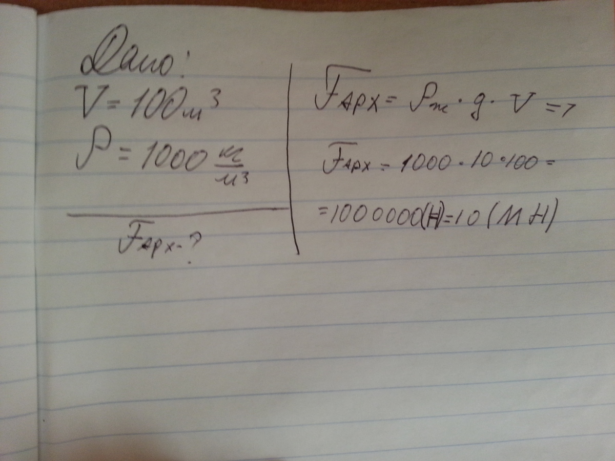 В воду погружено тело объёмом 100м3. Опредилите значение выталкивающей силы,действующей на это тело.Плотность воды 1000кг/м3 пж можно со скрином