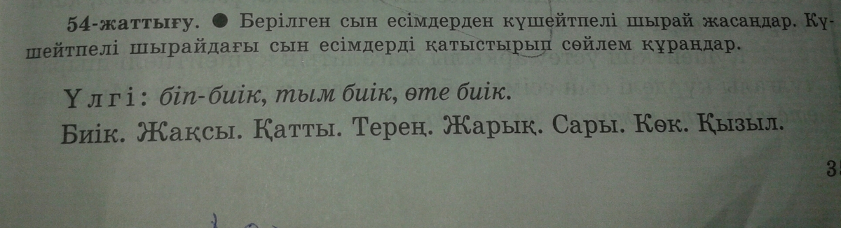 Жақсы жап жақсы, тым жақсы,өте жақсы.Қатты қап қатты,тым қатты.Терен теп терен, тым терен.Жарық жап жарық,тым жарық,өте жарық.Сары сап сары,тым сары,өте сары.Көк тым көк,өте көк ,көккімбек.Қызыл қып қызыл,тым қызыл,өте қызыл.