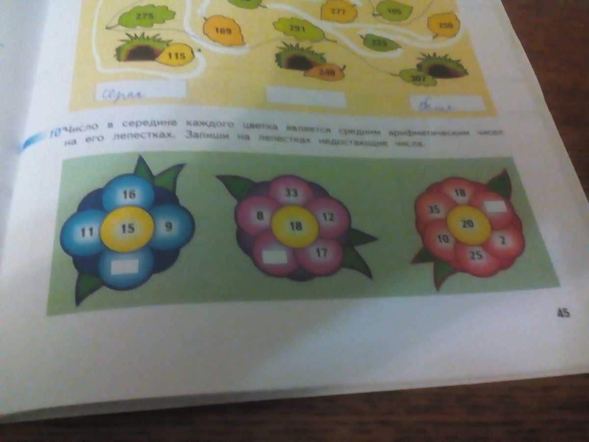 число в середине каждого цветка является средним арфметическим чисел на его лепистках. запишите недостоюшие числа