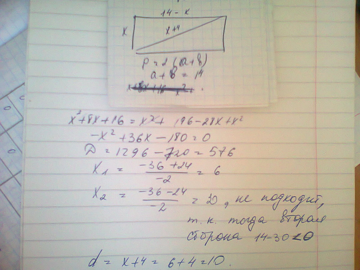 Диагональ прямоугольника больше одной из его сторон на 4 см. Найдите эту диагональ если периметр прямоугольника равен 28.