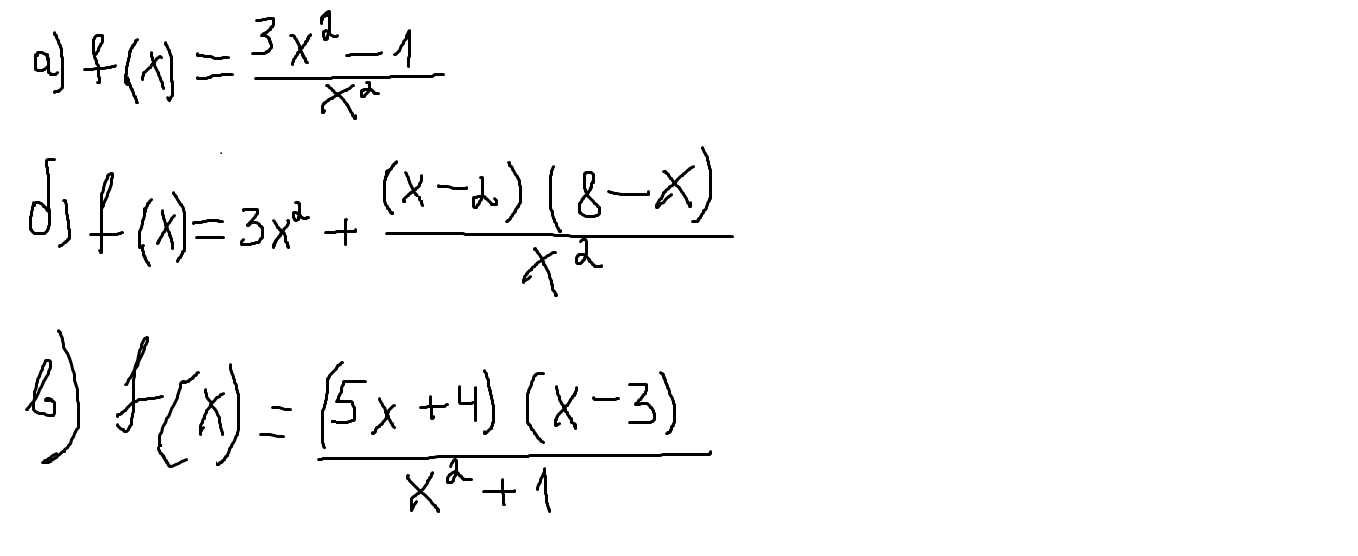 1) f '(x) = ((3x²-1) / x²)' = (6x*x² - 2x(3x²-1)) / x⁴ = (6x³-6x³+2x) / x⁴ = 2x/x⁴ = 2/x³