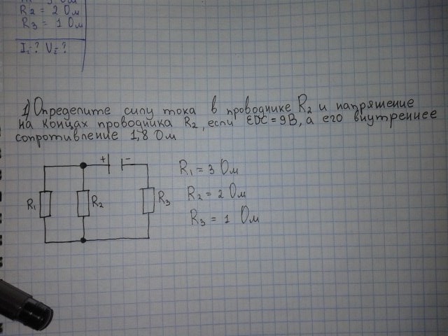 постоянный электрический ток.(фото внутри) определите силу тока в проводнике R2 и напряжение на концах проводника R2 если. ЭДС=9В а его внутреннее сопротивление 1,8 Ом.