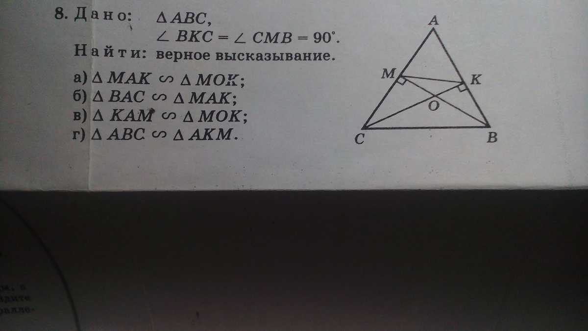 Очень странно, что в а) и в), а также в б) и г) указаны одинаковые треугольники. а) и в) - не могут быть подобны, так как ΔМОК - тупоугольный, а ΔКАМ - остроугольный (если использовать признак подобия Δ по 3 углам, ибо другие тут использоваться не могут(нет данных))