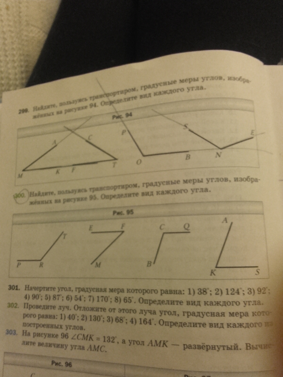 прикладываешь прямую транспортира к прямой угла, чтобы ризка совпала с R, потом с F, потом с C, и K (середины углов в задании) и тогда вторая прямая укажет на полукруге траспортира градусы.