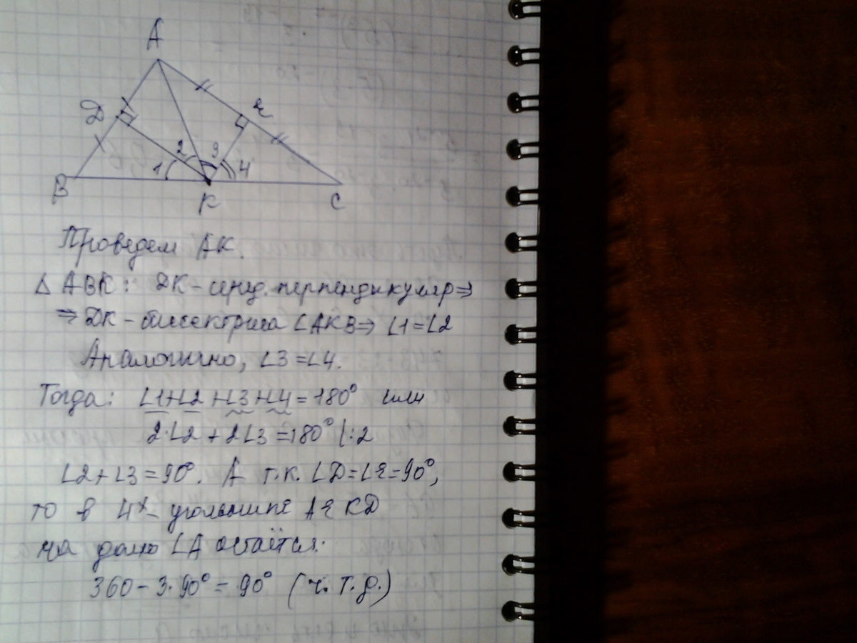 Серединные перпендикуляры к сторонам AB и AC треугольника ABC пересекаются в точке, лежащей на стороне BC. Докажите, что <A=90 градусов
