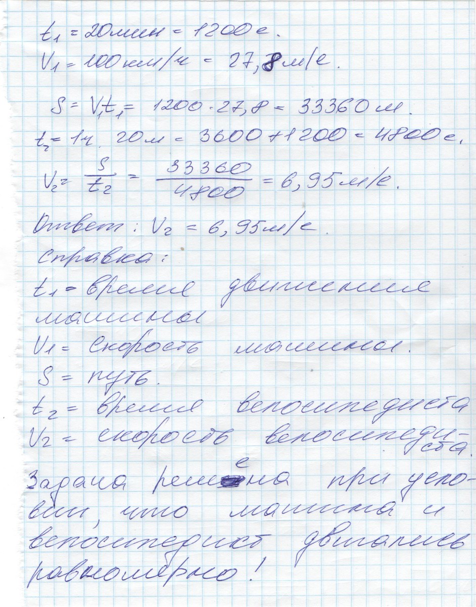 Помогите решить!Автомобиль ехал 20 мин. со скоростью 100 км/ч.С какой скоростью должен ехать велосипедист,чтобы проехать тот же участок пути за 1 ч.20мин.