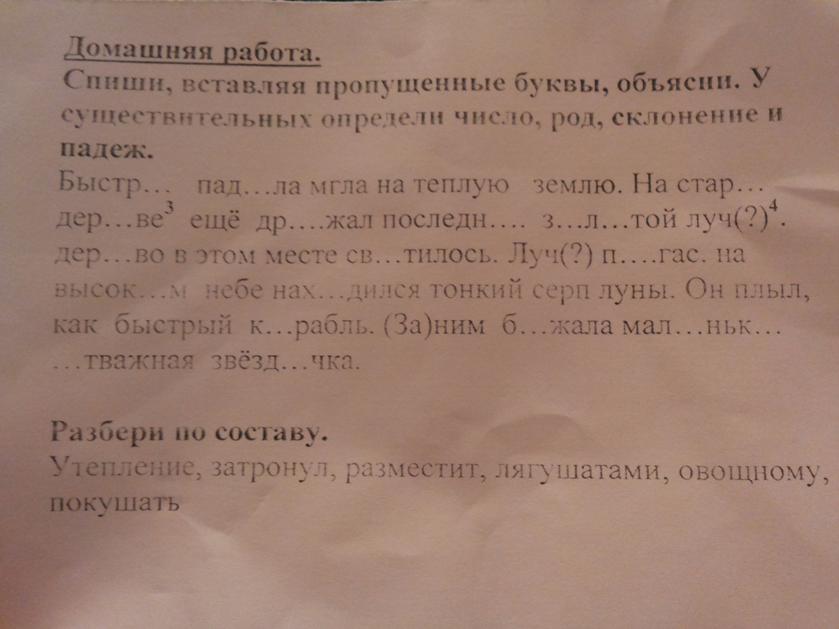 Быстро падала мгла(ед.число., женский род., 1 склонение., Им.падеж) на теплую землю(ед.число., 1 склонение., женский род., вин.падеж). На старом дереве(ед.число., ср.род., 2 склонение., предложный падеж) еще дрожал последний золотой луч(ед.число., мужск.род., 2 склонение., им.падеж), дерево(ед.число., ср.род., 2 склонение., им.падеж) в этом месте светилось. Луч(ед.число., мужск.род., 2 склонение., им.падеж) погас на высоком небе(ед.число., ср.род., 2 склонение., предложный падеж) находился тонкий серп(ед.число., мужск.род., 2 склонение., им.падеж) луны(ед.число., женск.род., 1 склонение., род.падеж). Он плыл как быстрый корабль(ед.число., мужск.род., 2 склонение., им.падеж). За ним бежала маленькая отважная звёздочка(ед.число., женск.род., 1 склонение., им.падеж).