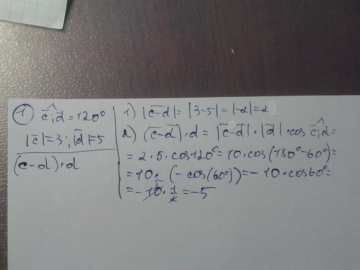 1) Угол между векторами с и d равен 120° , длина вектора |c|=3, |d|=5 . Найти скалярное произведение (c-d)*d