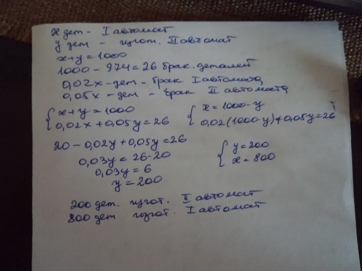 Два автомата изготовили 1000 деталей. В результате проверки оказалось, что первый автомат выдал 2% брака, а второй - 5% брака. Количество небракованых деталей составляло 974 штуки. Сколько деталей изготовил второй автомат?