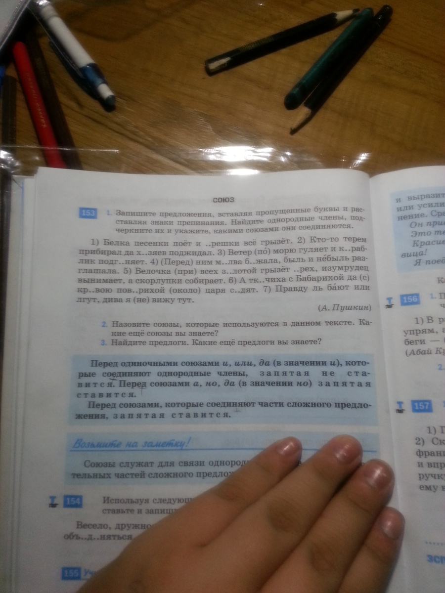 Белка песенки поет и орешки все грызет (поет и грызет - однородные, союз и). Кто-то терем прибирал да хозяев поджидал (прибирал, поджидал - однородные, союз да). Ветер по морю гуляет и кораблик подгоняет (гуляет, подгоняет - однородные, союз и). Перед ним молва бежала, быль и небыль разглашала (бежала, разглашала - однородные, союза нет, быль и небыль - однородные, союз и). Белочка при всех золотой грызет орех, изумрудец вынимает, а скорлупки собирает (грызет, вынимает, собирает - однородные, союза нет, орех. изумрудец, скорлупки - однородные, союз а). А ткачиха с Бабарихой да с кривою поварихой около царя сидят (ткачиха, Бабариха, повариха - однородные, союзы с, да). Правду ль бают или лгут, дива я не вижу тут (бают, лгут - однородные, союз или).