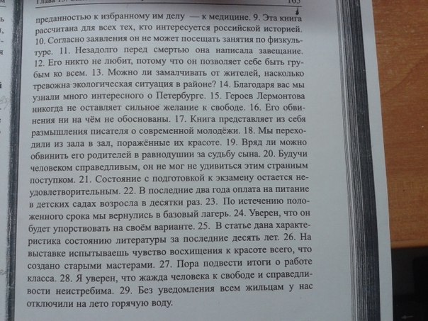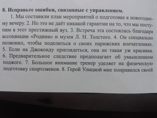 Мы составили план мероприятий по подготовке к новогоднему вечеру.Но это не дает никаких гарантий того, что мы поступим в этот престижный вуз. Встреча эта состоялась благодаря ассоциации "Родина" и музею Л.Н. Толстого. Он специально позвонил, чтобы поделиться своими парижскими впечатлениями.Если К Джоконде приглядеться, она не такая уж красивая. Предварительное следствие предполагает умышленный поджог. большое внимание тренер уделяет физической подготовке спортсменов. герой Улицкой мне понравился своей преданностью избранному им делу - медицине. Эта книга рассчитана на всех тех, кто интересуется российской историей. Согласно заявлению, он не может посещать занятия по физкультуре. Незадолго до смерти она написала завещание.