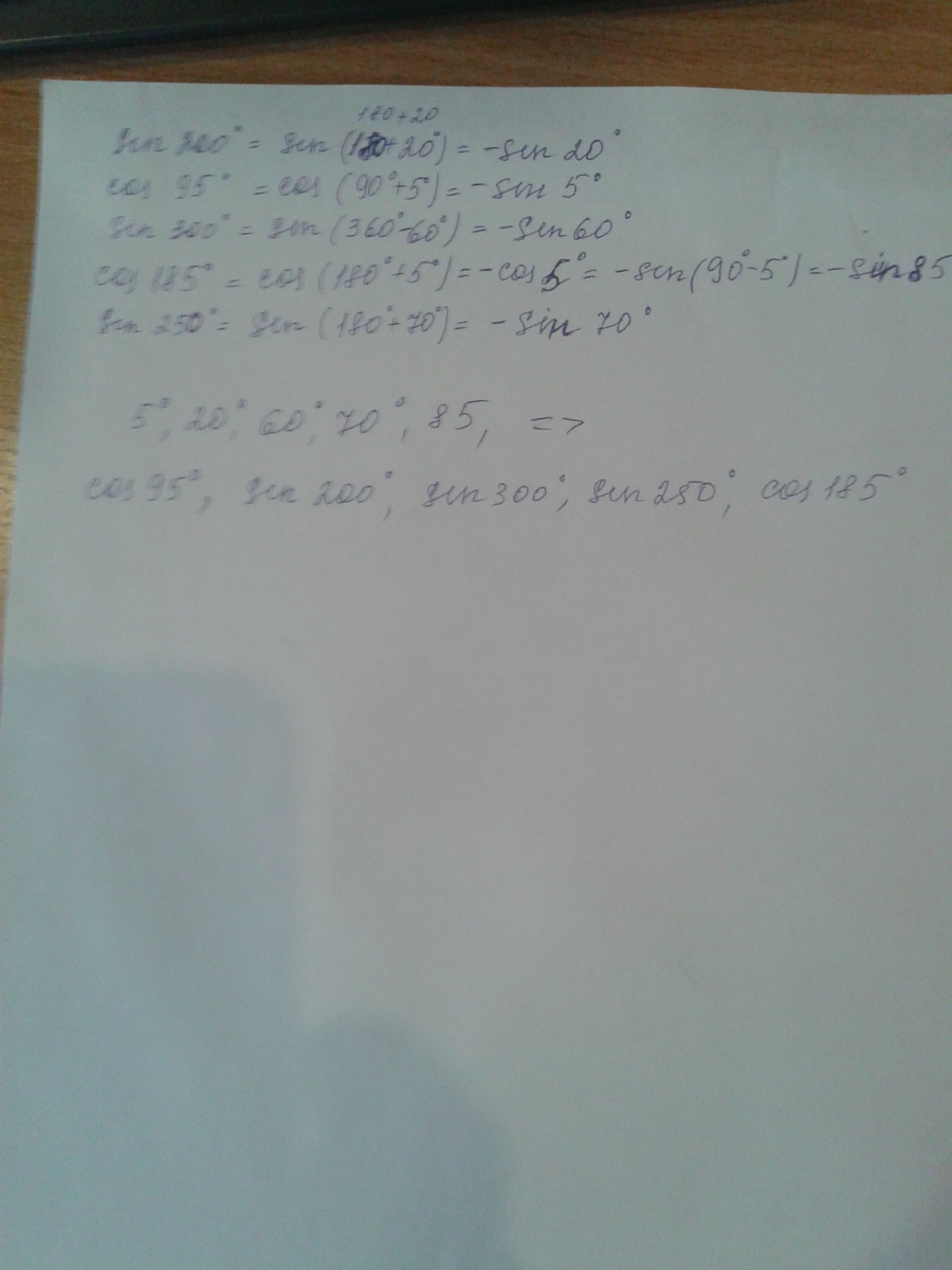Помогите с заданием! Расположить в порядке возрастания следующие углы( все углы перевести нужно в острые и потом разложить) : sin 200 , cos 95 , sin 300 , cos 185 , sin 250 .