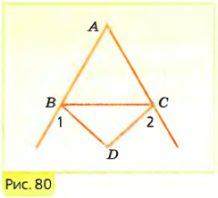 г) Отрезки AB и AC на рисунке 80 равны и ∠1 = ∠2. Докажите, что треугольник DBC равнобедренный.