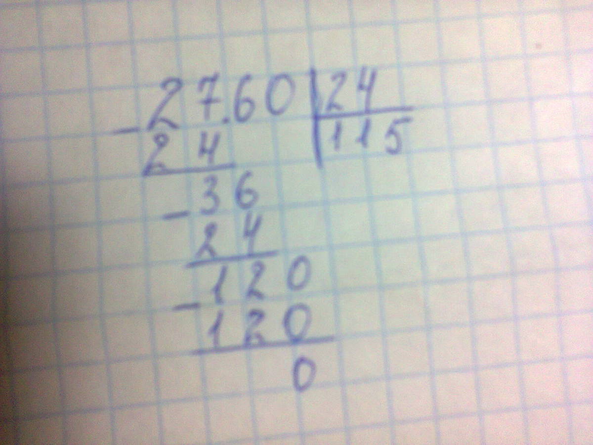 2760:24= 27:4 пишем 1 затем остаток 3 сносим 6 получается 36 делим на 24 получается 1остается 12 сносим 0 получается 120 делим на 24 получается 5