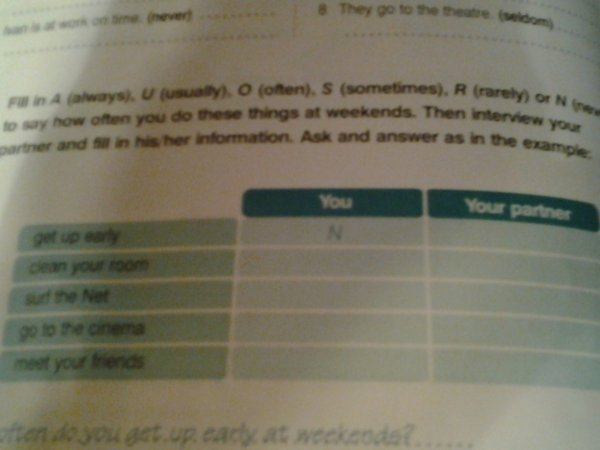 Заполнить (всегда), O (часто), S (иногда), R (редко), N (никогда), чтобы сказать, как часто вы делаете эти вещи в weekends.Then интервью вашей parther и заполнить его / ее информацией. Задать и ответить, как в примере.