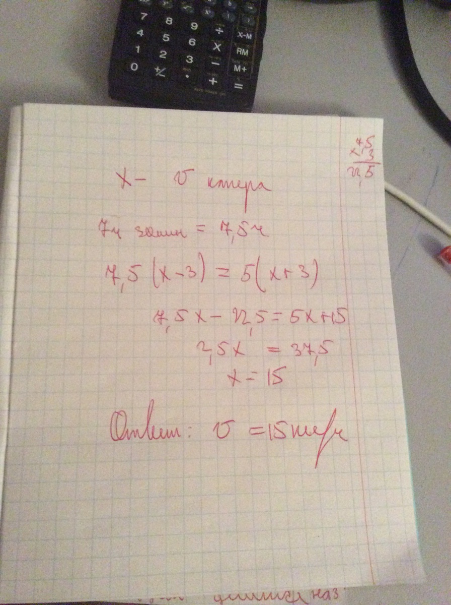 За 7ч 30мин против течения катер проходит такое же расстояние, что и за 5ч по течению. Найдите скорость катера, в стоячей воде, если скорость течения 3 км/ч