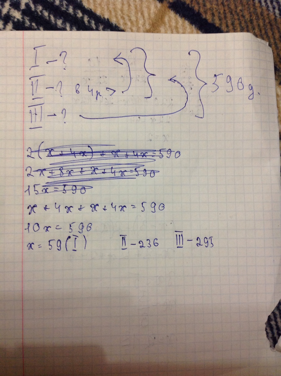 Рабочие трех бригад изготовили за смену 590 деталей. Вторая бригада изготовила деталей в 4 раза больше,чем первая,а третья-столько же,сколько первые две бригады изготовили вместе.