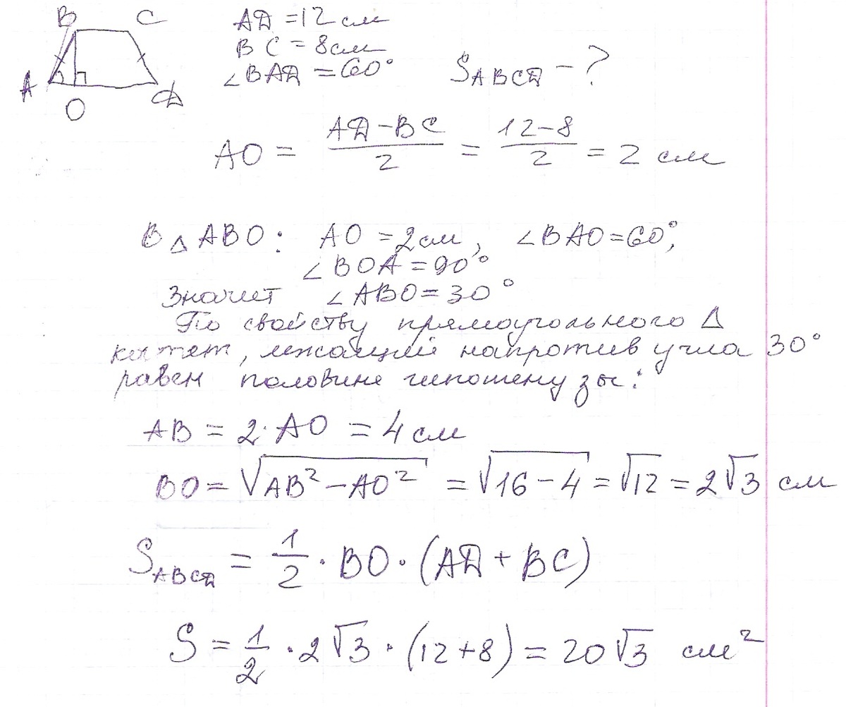 Найдите площадь равнобокой трапеции ABCD с большим основанием AD=12cm,BC=8cm, m( угол A)=60 градусов