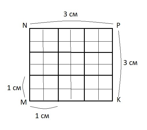 начерти квадрат MNPK, длина стороны которого равна 3 см . раздели его по линиям клеток на 9 равных частей. найди площадь одной такой части.