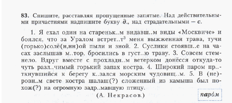 1.Я ехал один на стареньком видавшем(Д) виды «Москвиче» и боялся, что за Уралом встретит меня выжженная(С) трава, тучи горько-соленой пыли и зной.2. Суслики, стоявшие(Д) на часах, заслышав мотор, бросились в густую траву.3.Совсем стемнело.Вдруг вместе с прохладным ветерком донесся откуда-то чуть различимый(С) горький запах костра.4. Широкий паром, приткнувшийся(Д) к берегу, казался морским чудовищем.5. В неровном свете костра шалаш, сложенный(Д) из камыша, был похож на огромную задремавшую(Д) птицу.