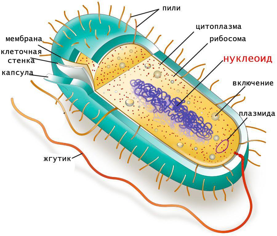 Бактериальное хранилище наследственной информации называется нуклеоидом и представляет собой одну кольцевую хромосому,располагающуюся примерно в центре в клетки,в цитоплазме.