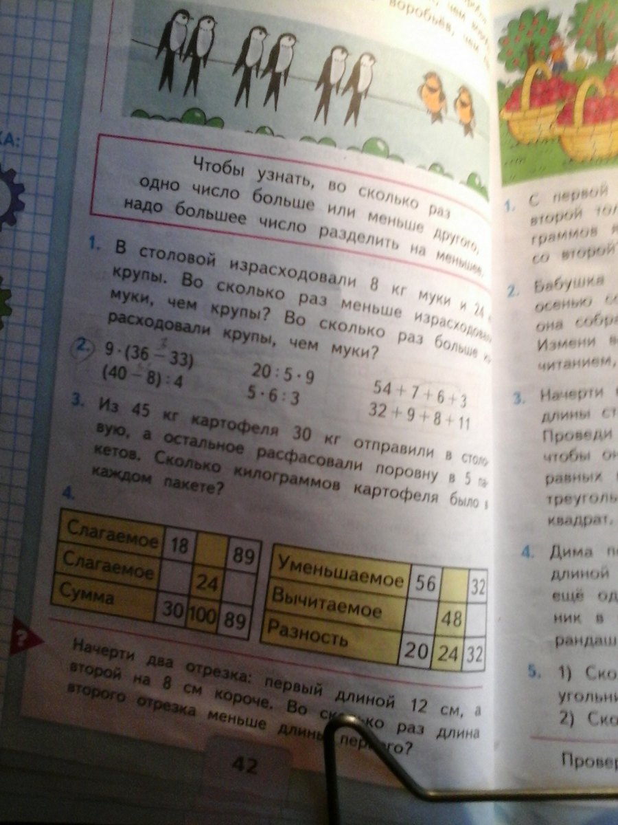 муки израсходовали в 3 раза меньше, чем крупы. Крупы израсходовали в 3 раза больше,чем муки