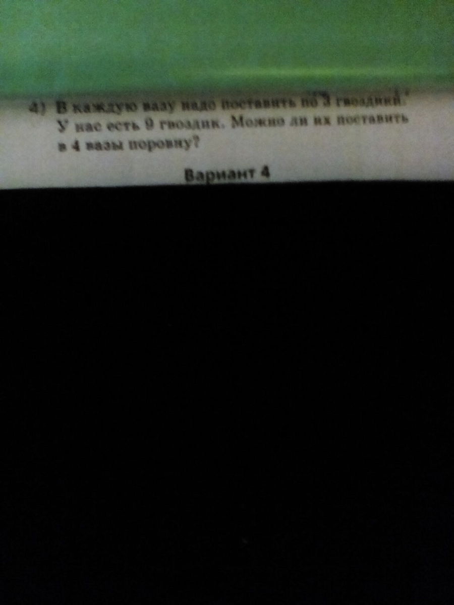 в каждую вазу надо поставить по 3 гвоздики. У нас есть 9 гвоздик . Можно ли их поставить в 4 вазы поровну. пожалуйста решитте с ответам и собьеснениями и сответам полную задачу задача номер 4