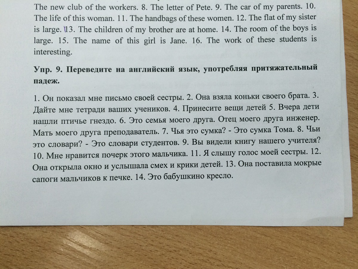 1. He showed me a letter fo his sister. 2. She took skates of her brother. 3. Give me the notebooks of your pupils. 4. Bring the things of the children. 5. Yesterday the children found a nest of bird. 6. This is the family of my friend. Father of my friend is engineer. 7. Whose bag is this? -This is the bag of Tom. 8. Whose dictionaries are these? - These are the dictionaries of students. 9. Did you see the book of our teacher? 10. I like a handwriting of this boy. 11. I hear the voice of my sister. 12. She opened a window and she listened laughter and cries of the children. 13. She put the wet boots of boys to the stove. 14. This is an armchair of my granny.