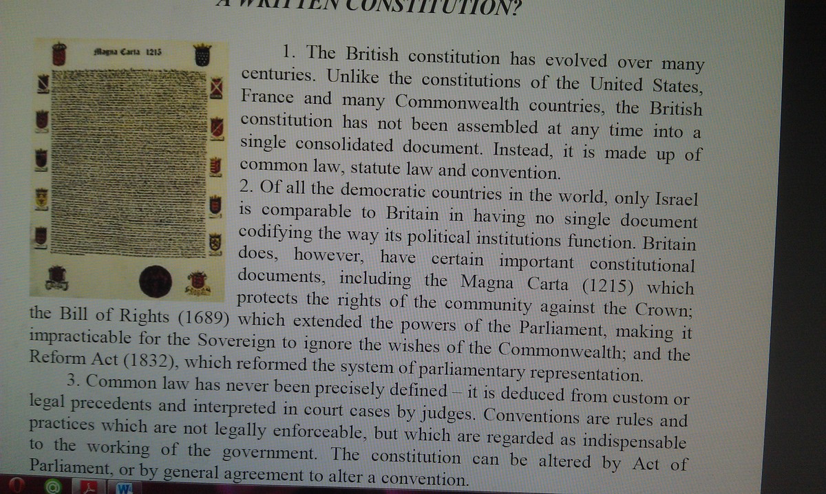 2. Из всех демократических стран мира, только Израиль может сравниться с Великобританией в неимении единого документа. который бы систематизировал функционирование политических организаций. у Британии, однако, есть определенный важный конституционный документ, включающий Великую Хартию Вольностей ( 1215), которая защищает права общества и направлена против королевской власти; Биль о правах (1689), который расширяет власть парламента и делает невозможным игнорирование Монархом желаний Содружества Наций; и Акт Реформ ( 1832), который реформирует систему парламентского представительства.