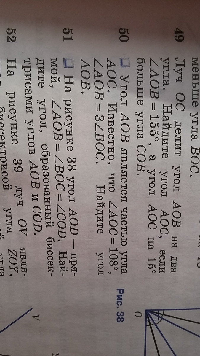 Угол ВОС=х, тогда угол АОВ=3х. Угол АОС - сумма этих двух углов, т. е. х+3х= 108; 4х=108; х=108:4=27