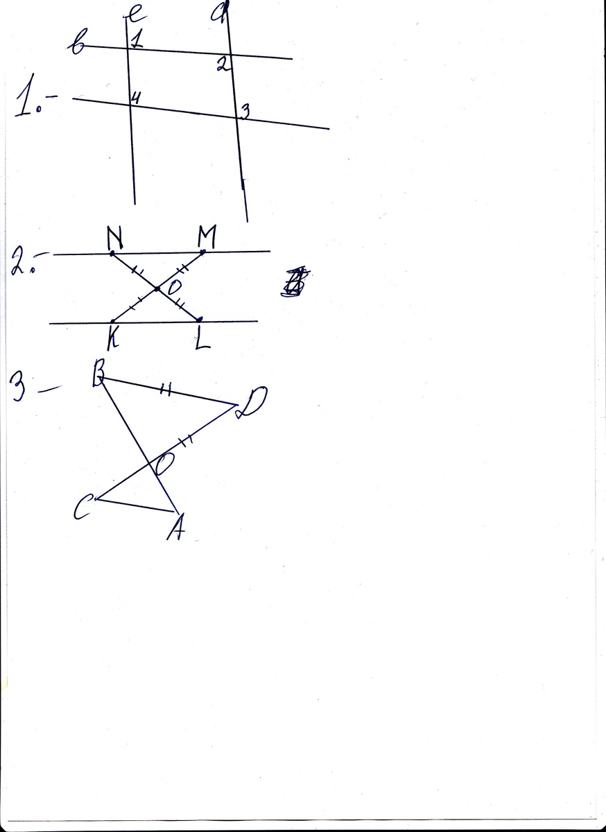 2. Равные отрезки KL и NM лежат на парарельных прямых. Отрезки KM и LN пересекаются в точке О. Докожите,что отрезки KL и NM в точке пересечения деляться на пополам.